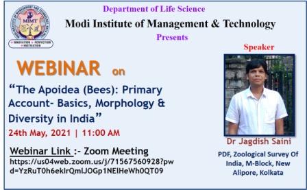 Webinar organized by Modi Institute of management & Technology on “Apoidea (Bees) : Primary Account – Basics , Morphology & Diversity in India ” delievered by Dr. Jagdish Saini